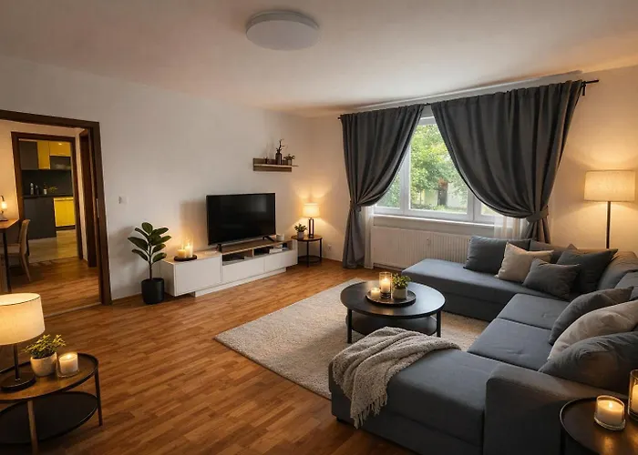 Este apartamento de 68 m² está ubicado en el barrio Petrzalka de Bratislava, a unos 2 km de la Estatua del Soldado del Ejército de Napoleón. Los huéspedes encontrarán fácilmente el Bunker BS-8, que está a unos cuantos pasos del apartamento.